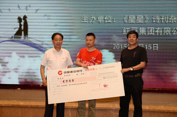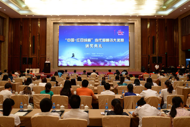 為了進(jìn)一步繁榮愛情詩創(chuàng)作,弘揚(yáng)正確愛情觀,特別是推動(dòng)中國(guó)當(dāng)代愛情詩再度輝煌,2014年7月1日,由《星星》詩刊雜志社與紅豆集團(tuán)聯(lián)合啟動(dòng)了“中國(guó)?紅豆絨杯”當(dāng)代愛情詩大獎(jiǎng)賽征文活動(dòng),作為紅豆七夕節(jié)的一項(xiàng)重要活動(dòng)。現(xiàn)在經(jīng)過一年的征集及后期評(píng)選,在今年七夕——中國(guó)情人節(jié)前夕頒獎(jiǎng)。