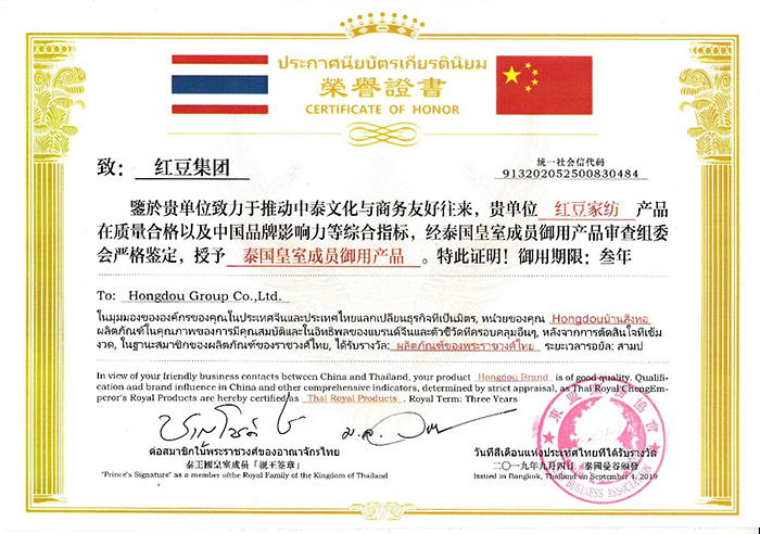 2019年9月4日,紅豆集團紅豆家紡公司應邀參加2019年東盟經貿發展(曼谷)合作論壇,紅豆家紡公司總經理錢振宇先生帶領一行人員參加此次會議,紅豆家紡首次走出國門,詮釋對健康水碾、舒適生活的全新定義,從而引領健康睡眠的需求。在此次會議上,紅豆家紡公司總經理向泰國旺猜親王進貢紅豆乳膠枕、紅豆襯衫,獲得皇室旺猜親王的高度評價,并授予紅豆集團紅豆家紡產品為“泰國皇室御用產品”。同時,錢振宇先生代表紅豆集團董事局主席兼CEO周海江,接受中泰國王勛章,中泰友好使者榮譽。