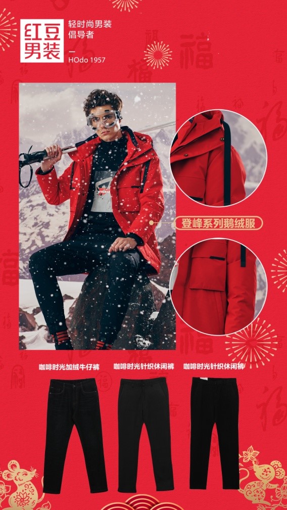 紅色代表著喜慶、吉祥和幸福,也包含著對(duì)新的一年美好的祝愿,過(guò)年在穿著中加點(diǎn)紅色成為一種約定俗成的傳統(tǒng)。紅豆男裝登峰系列中的紅色鵝絨服突破了秋冬里一貫的沉悶色調(diào),為整體刻畫出鮮艷活潑的造型,內(nèi)搭印花衛(wèi)衣或毛衫,下裝選擇黑色或者藏青色深色系的休閑褲,中和了紅色的跳脫。穿上這一身走親訪友,為許久不見的長(zhǎng)輩帶去新年的問(wèn)候與祝福。