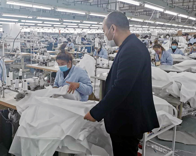 為了生產(chǎn)順利進行,徐亞東首先梳理出哪些員工符合上崗要求,做好溝通,動員返廠。復(fù)工后徐亞東與職工并肩作戰(zhàn),每天穿梭在生產(chǎn)車間,協(xié)調(diào)組織防護服生產(chǎn),一直沒有停下忙碌的腳步,加班也成為他的工作常態(tài)。
