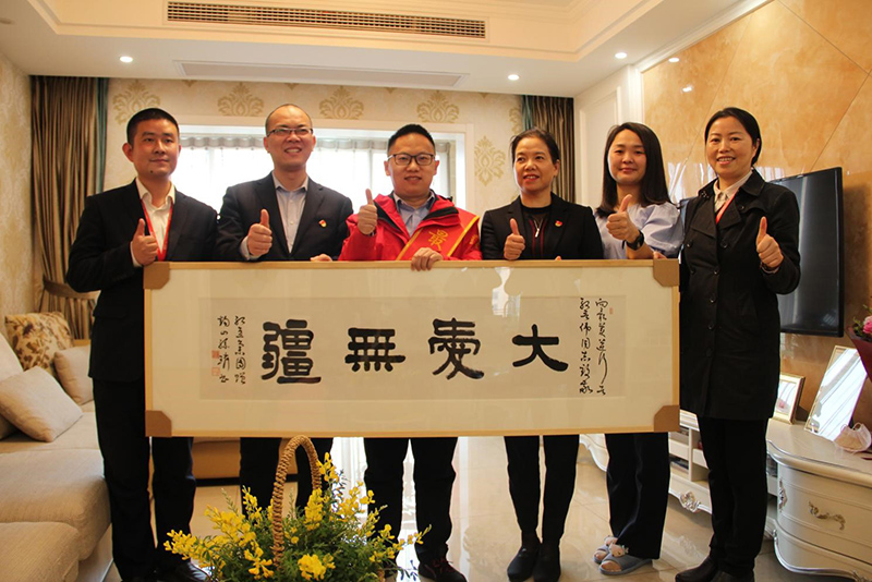 下午,紅豆集團常務副總裁、國際公司董事長戴敏君,集團品牌文化部部長錢文華率紅豆物業(yè)團隊來到殷晉偉家,上門送上最誠摯的慰問,贈予殷晉偉“大愛無疆”牌匾,代表紅豆集團全體員工向英雄表達崇高敬意!“大愛無疆”牌匾由中國書法家協(xié)會理事、無錫市國畫院院長孫璘先生親自揮毫書寫,筆鋒蒼勁有力,一筆一畫盡顯孫璘先生對“逆行英雄”的真情真意。